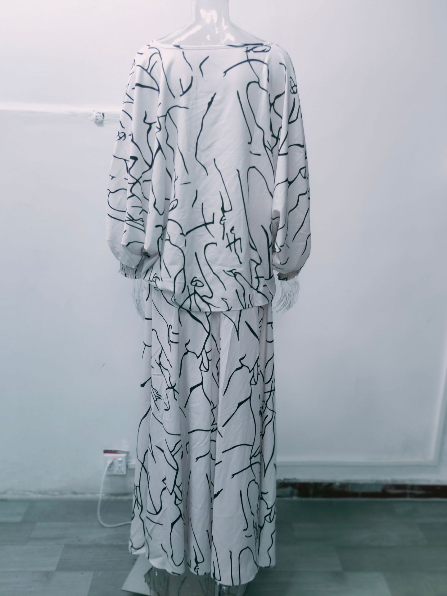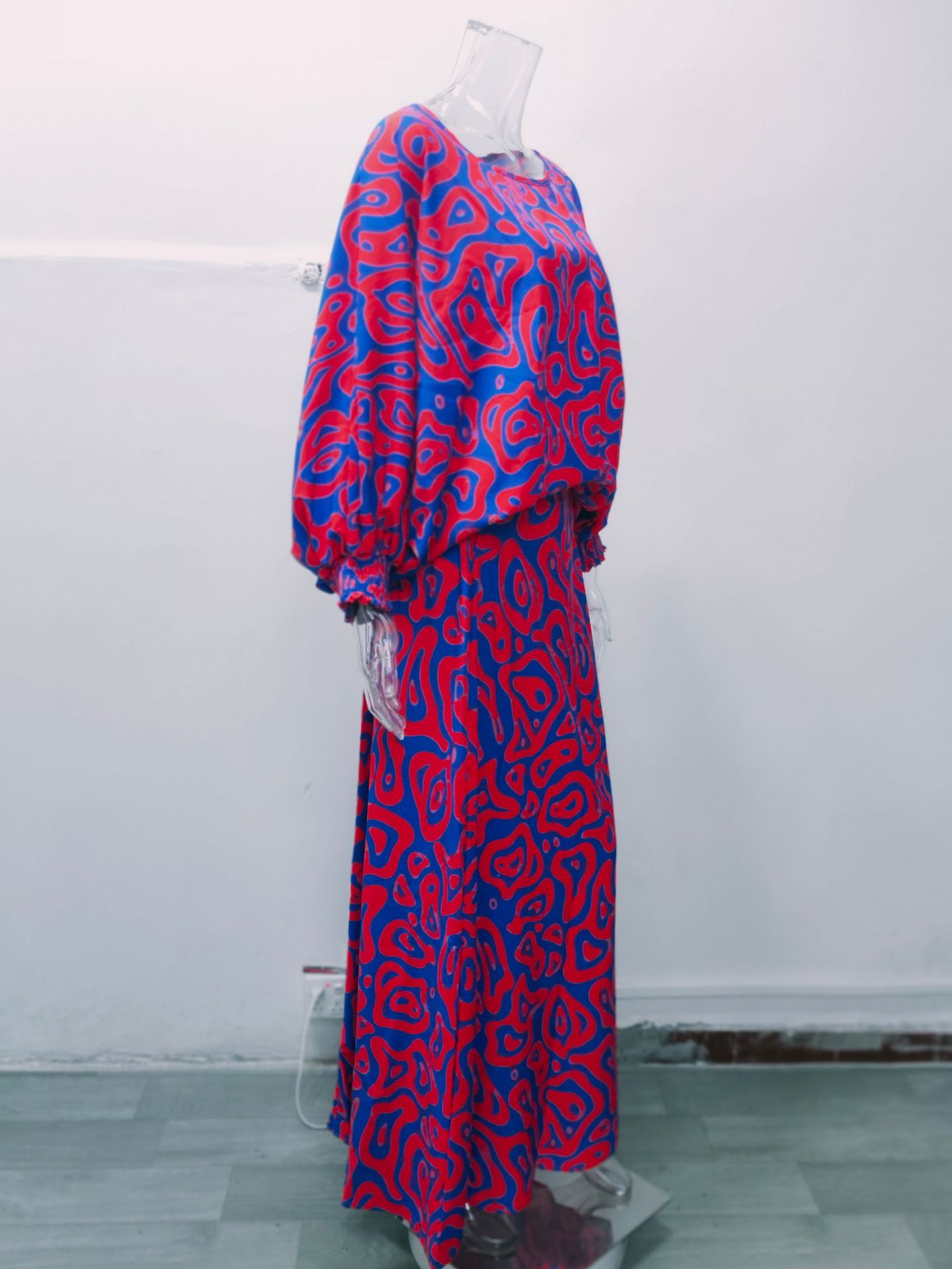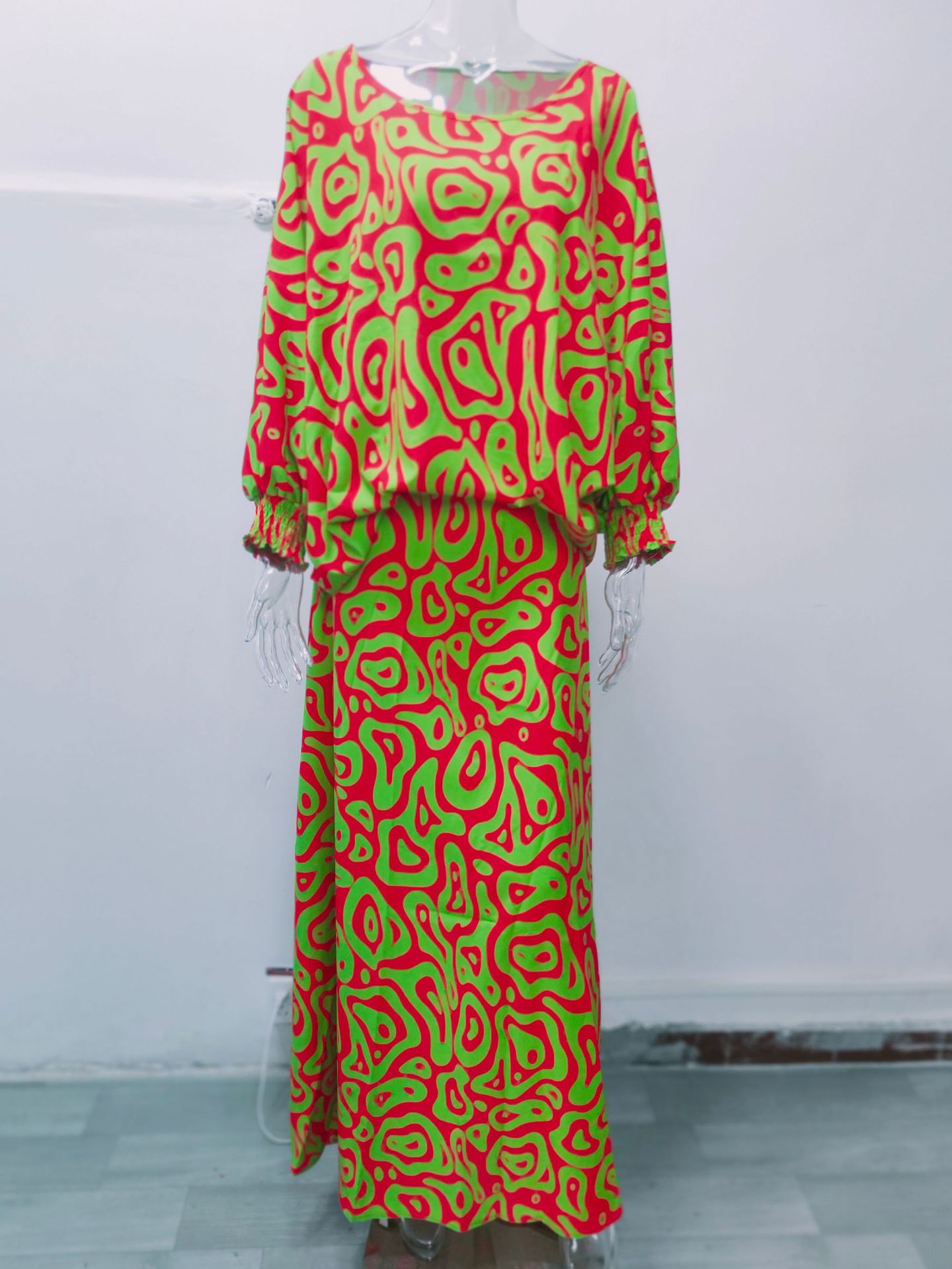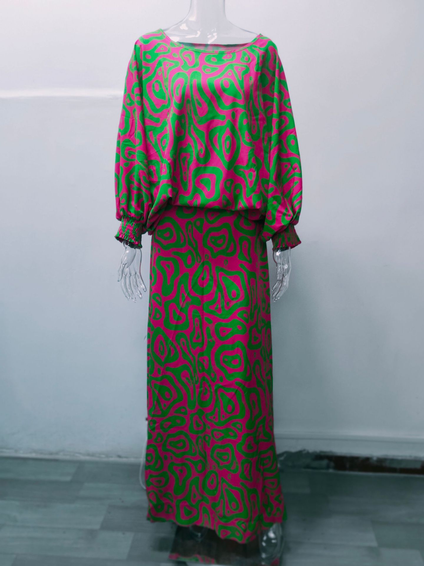 Women's Summer New Loose Large Size Printed Long-sleeved Top High Waist Half-length Dress Suit