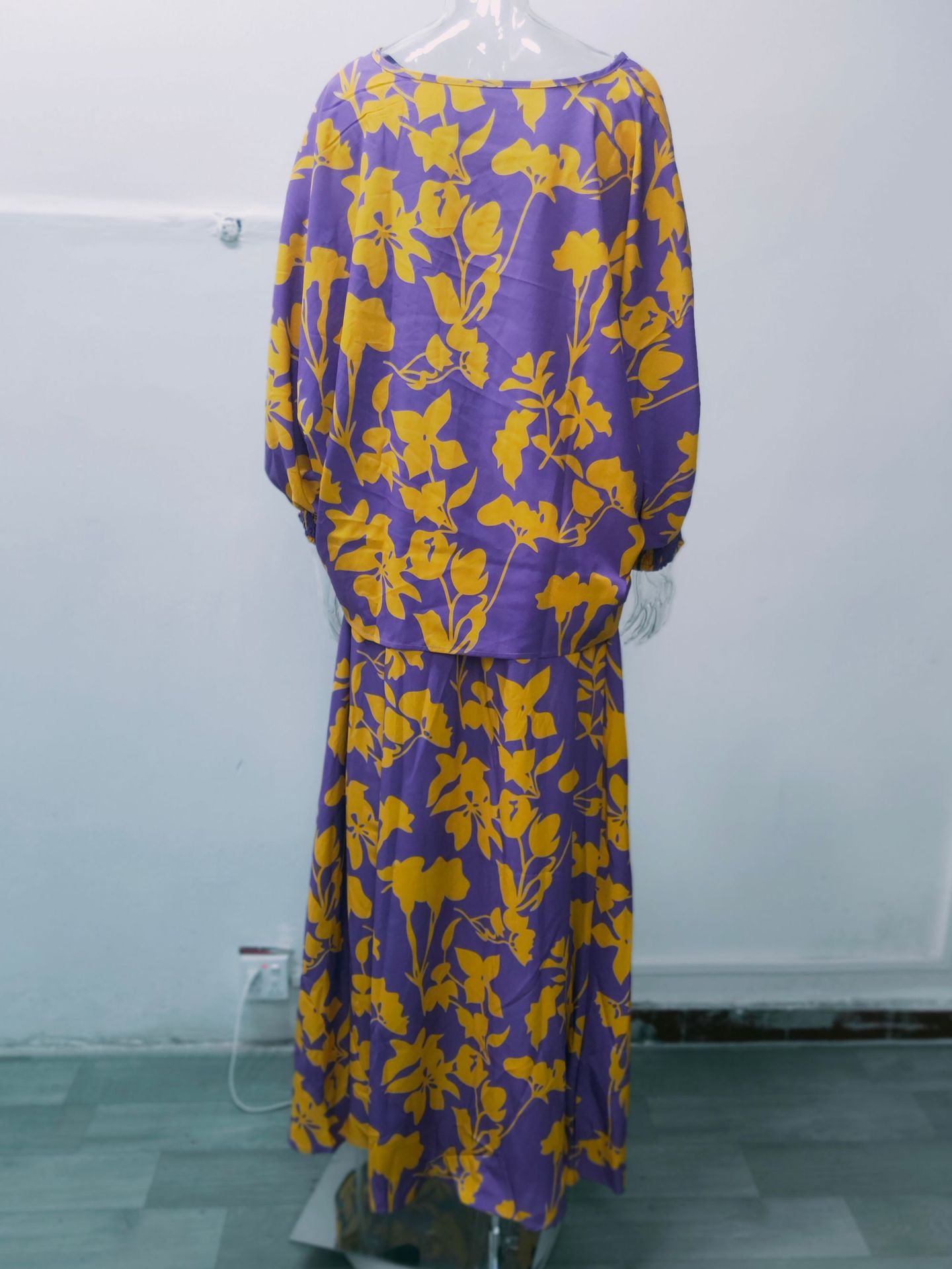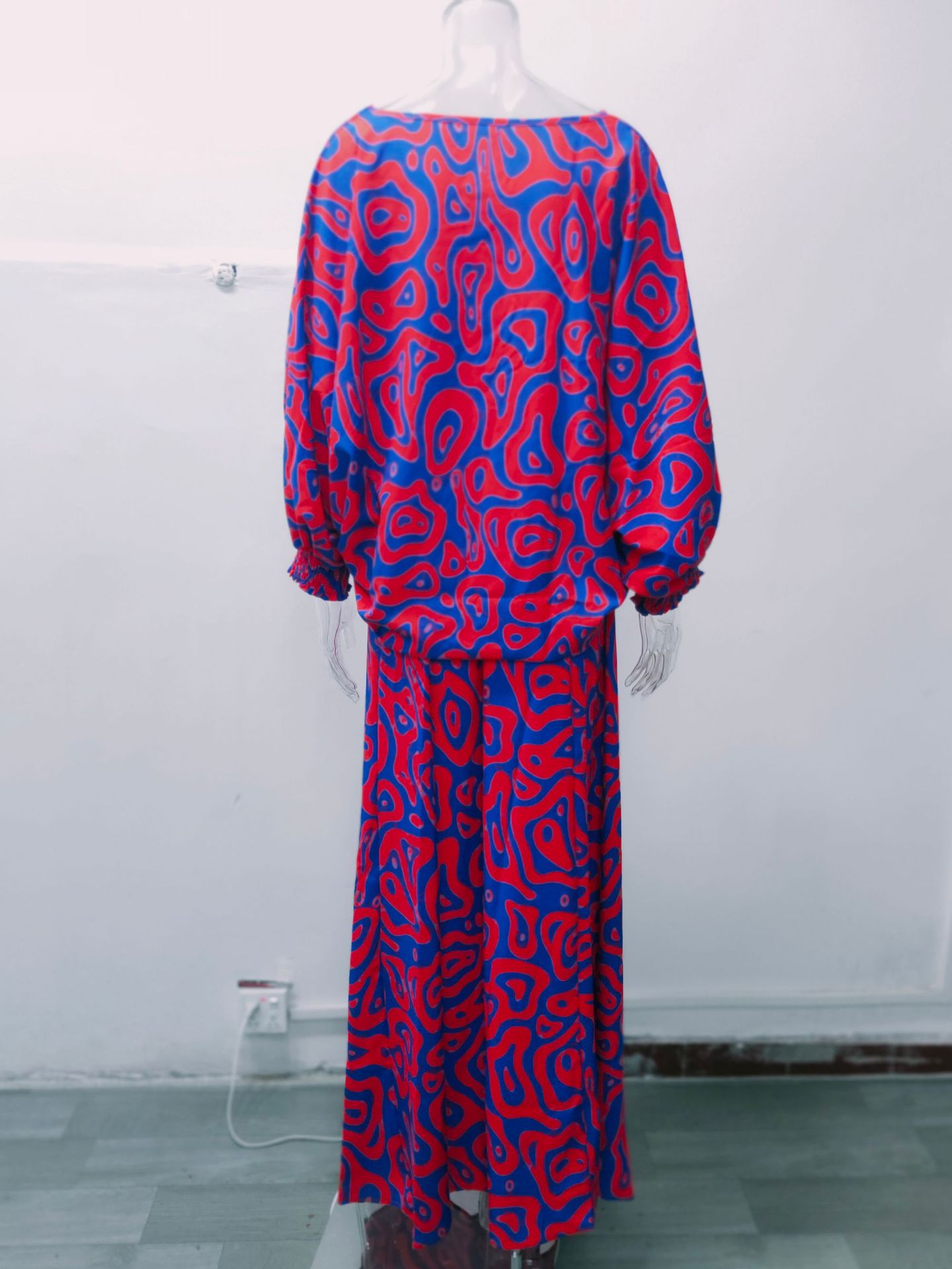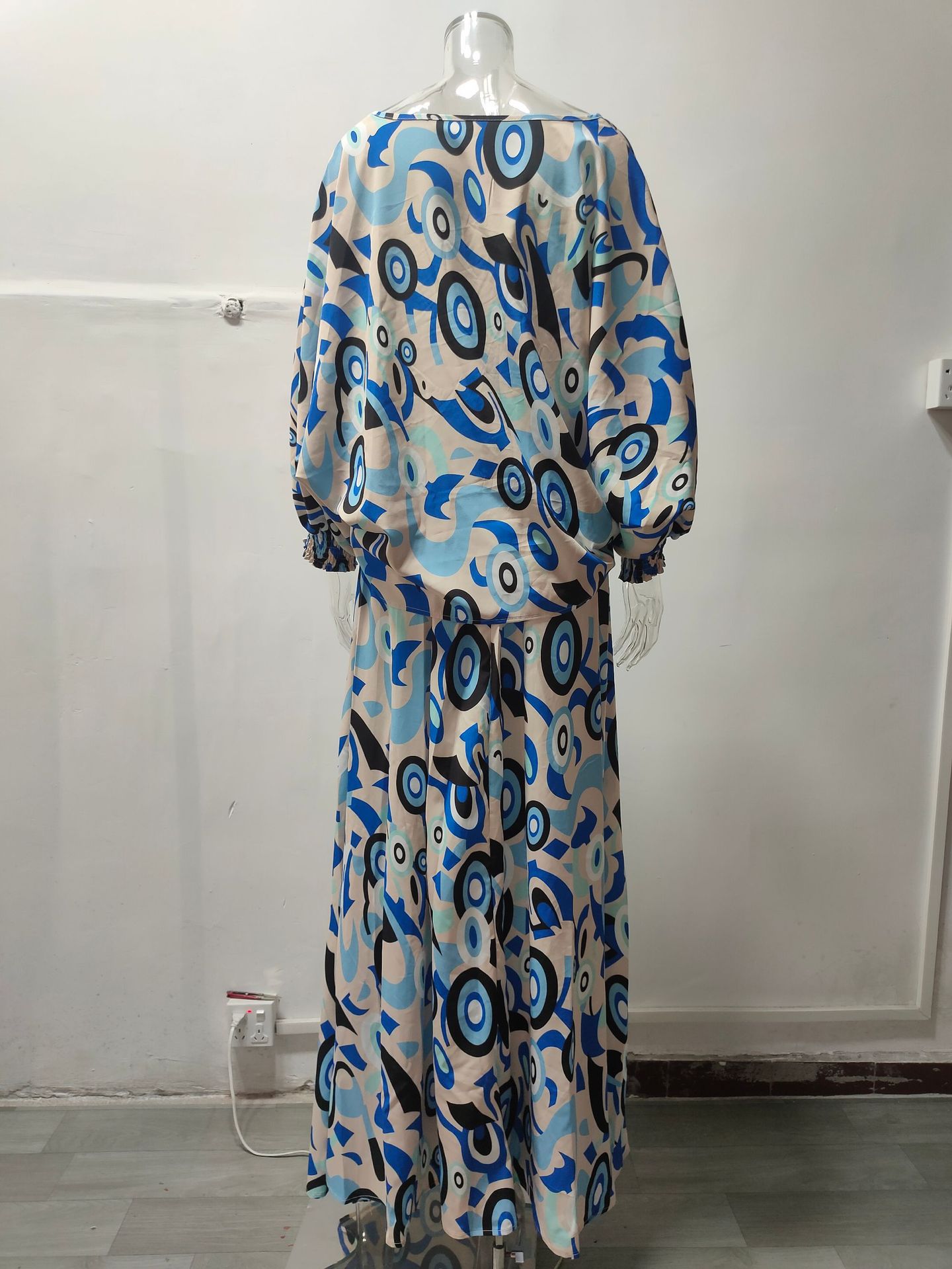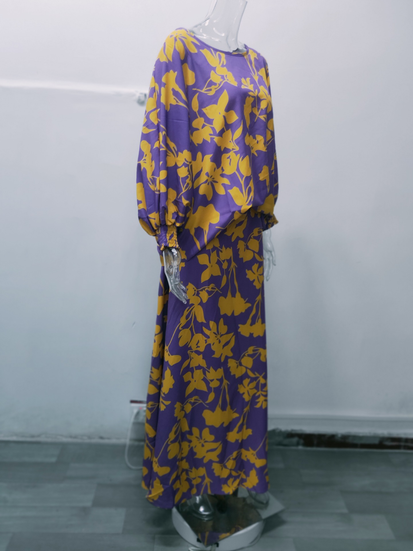Women's Summer New Loose Large Size Printed Long-sleeved Top High Waist Half-length Dress Suit